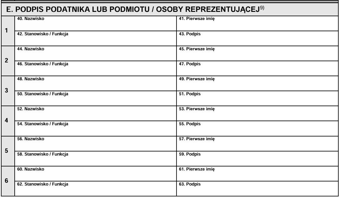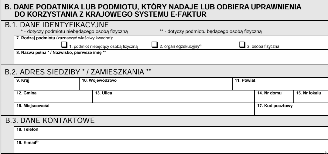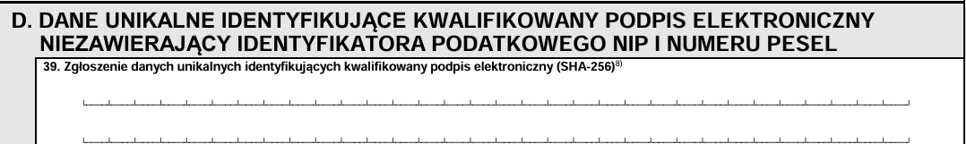 - Section D is filled in only in special cases (e.g., changing a qualified signature certificate, or for foreigners without a NIP/PESEL).